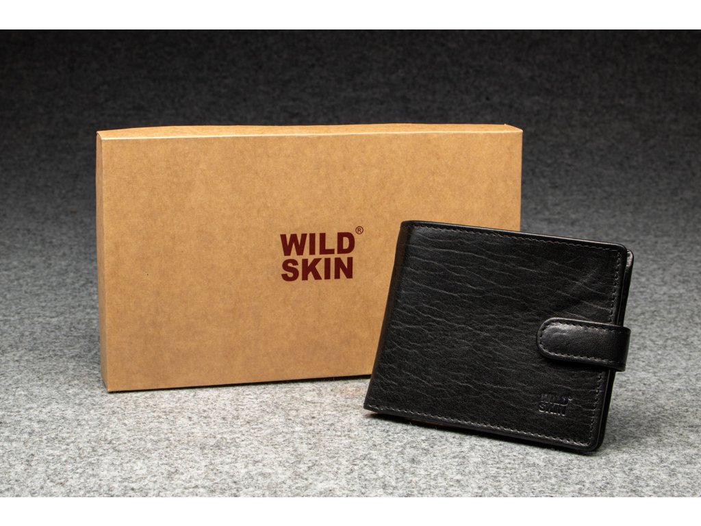 Pánská peněženka SCOTT Black je ušitá z lesklé kůže. Vnější zápinka se postará o tom, aby vám nevypadávaly karty a doklady. Vnitřní výbava zahrnuje mincovku, čtyři přihrádky na karty, a dvě přihrádky na bankovky. Logo WILD SKIN na čelní straně je provedeno reliéfní ražbou. Vnější rozměry: 12,5 x 9,5 x 2 cm.