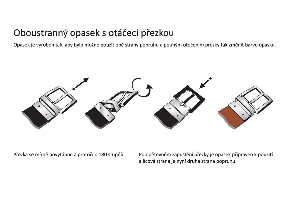 Kožený oboustranný opasek o šířce popruhu 35 mm se využijete k obleku nebo do volnočasových kalhot. Italská, pololesklá useň, stříbrná elegantní italská spona. Opasek lze zkracovat díky imbusovým šroubkům, kterými je spona připevněna k popruhu.
