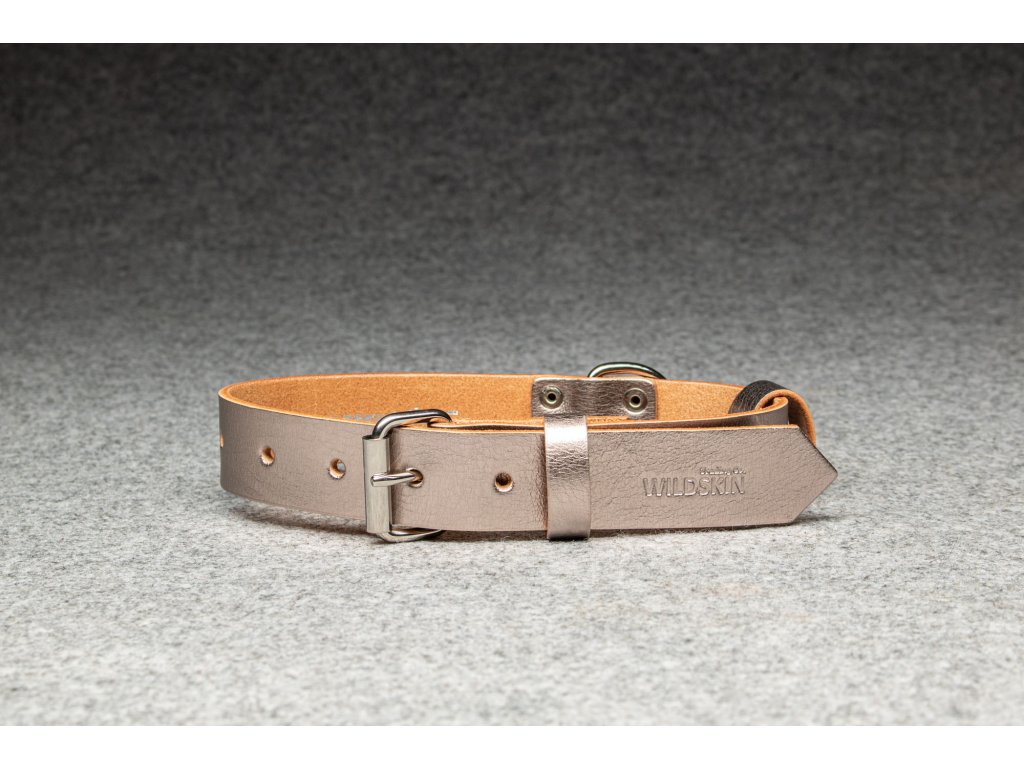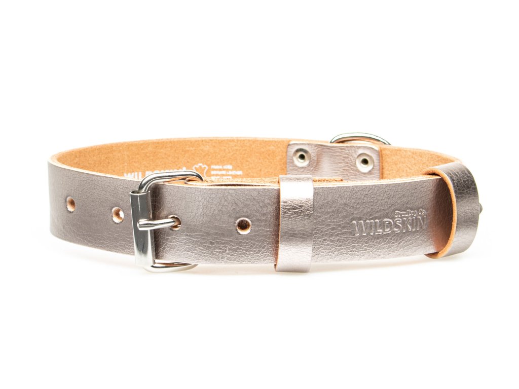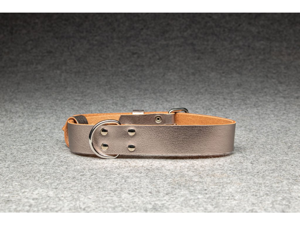 Kožený obojek z italské, hovězinové usně se stříbrnou povrchovou úpravou. Kovová přezka s rolnou a svařovaný polokroužek pro uchycení vodítka jsou v nerezové povrchové úpravě.