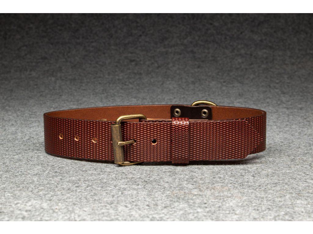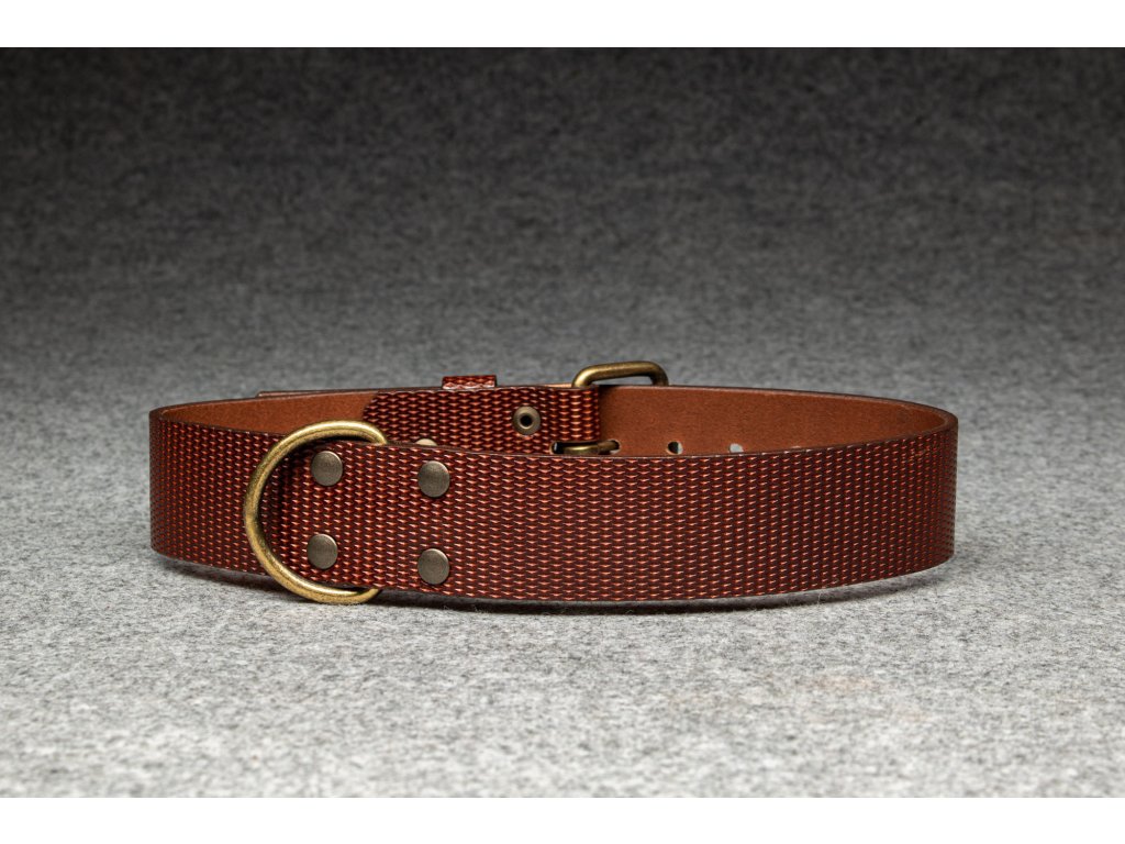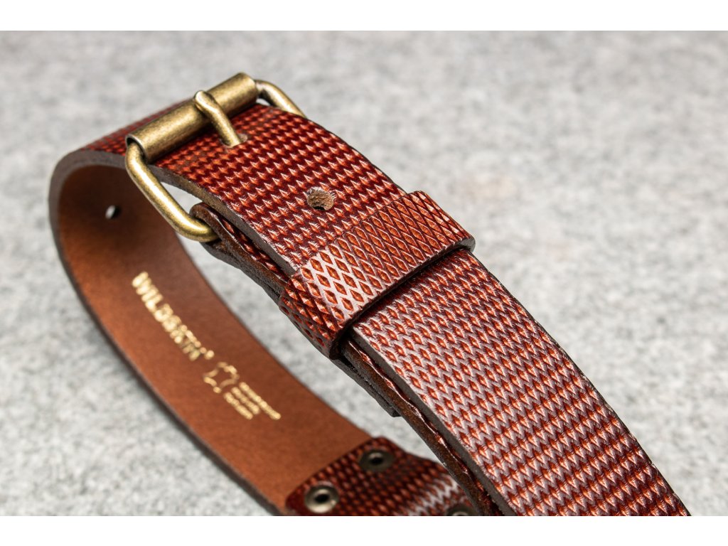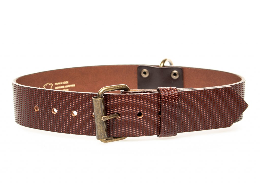 Kožený obojek z italské, hovězinové usně DIAMOND – tlačený desén. Kovová přezka s rolnou a svařovaný polokroužek pro uchycení vodítka jsou v povrchové úpravě staromosaz.