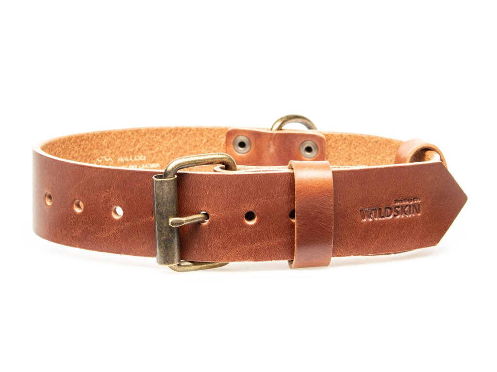 Kožený obojek z italské, probarvené hovězinové usně. Kovová přezka s rolnou a svařovaný polokroužek pro uchycení vodítka jsou v povrchové úpravě staromosaz.
