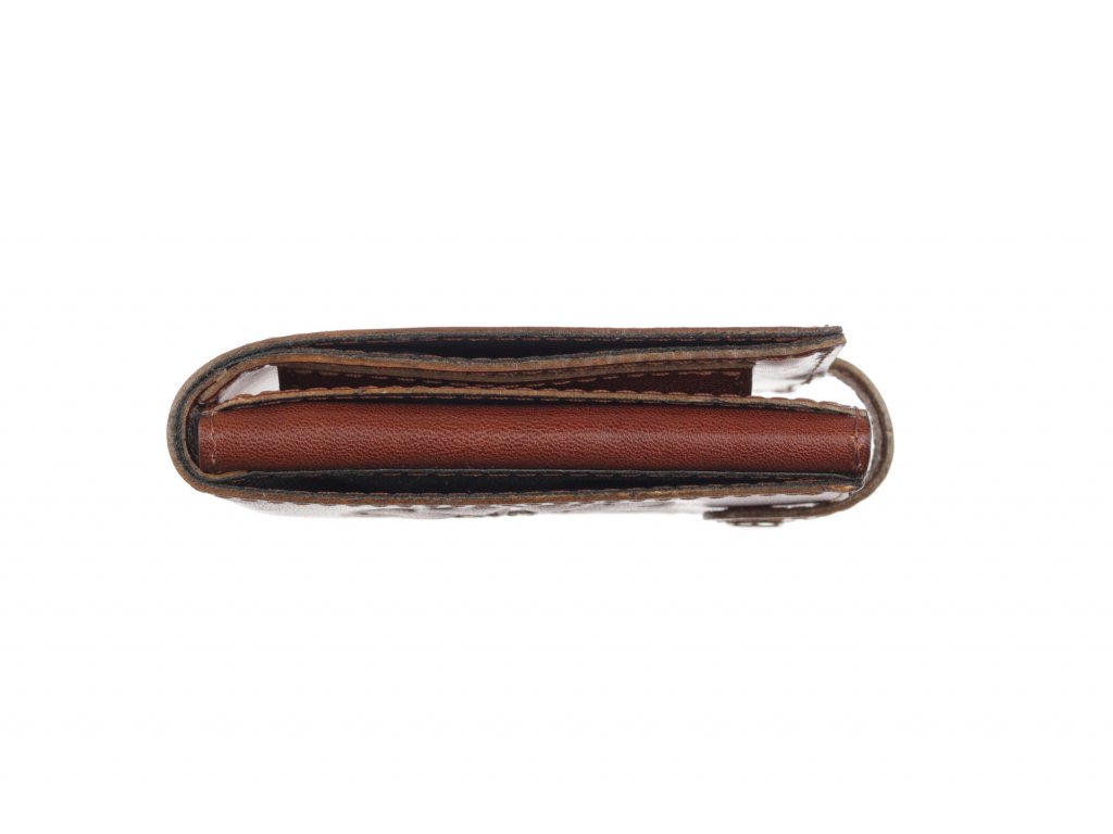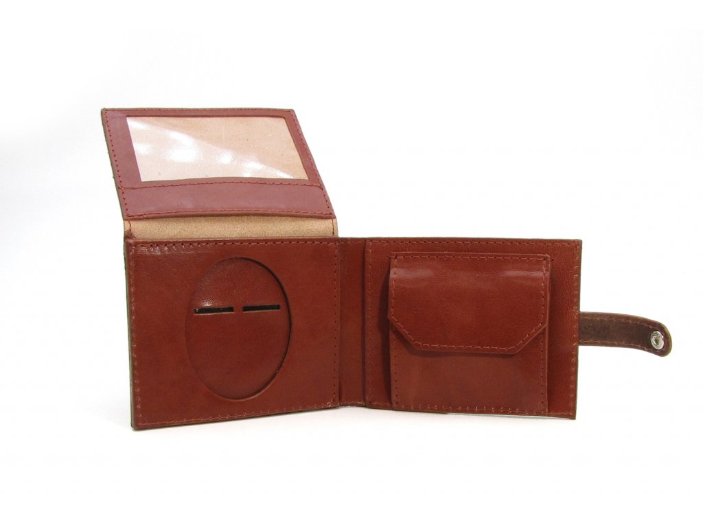 Kožený obal na služební průkaz a odznak SKPV Policie ČR. Dokladovka je zhotovena z pravé, italské, hovězinové kůže TAMPA Cognac - hnědá, lesklá. Výbava: zapínací kapsa na mince (mincovka) vpravo uvnitř, vodorovná vyklápěcí klopa na tři karty plus průhledné okno z druhé strany, kde je možno umístit např. průkaz. Do levé vnitřní strany lze upnout služební odznak Kriminální Policie ČR. Dokladovka je doplněna jednou přihrádkou na bankovky. Rozměry: 110 x 90 mm.