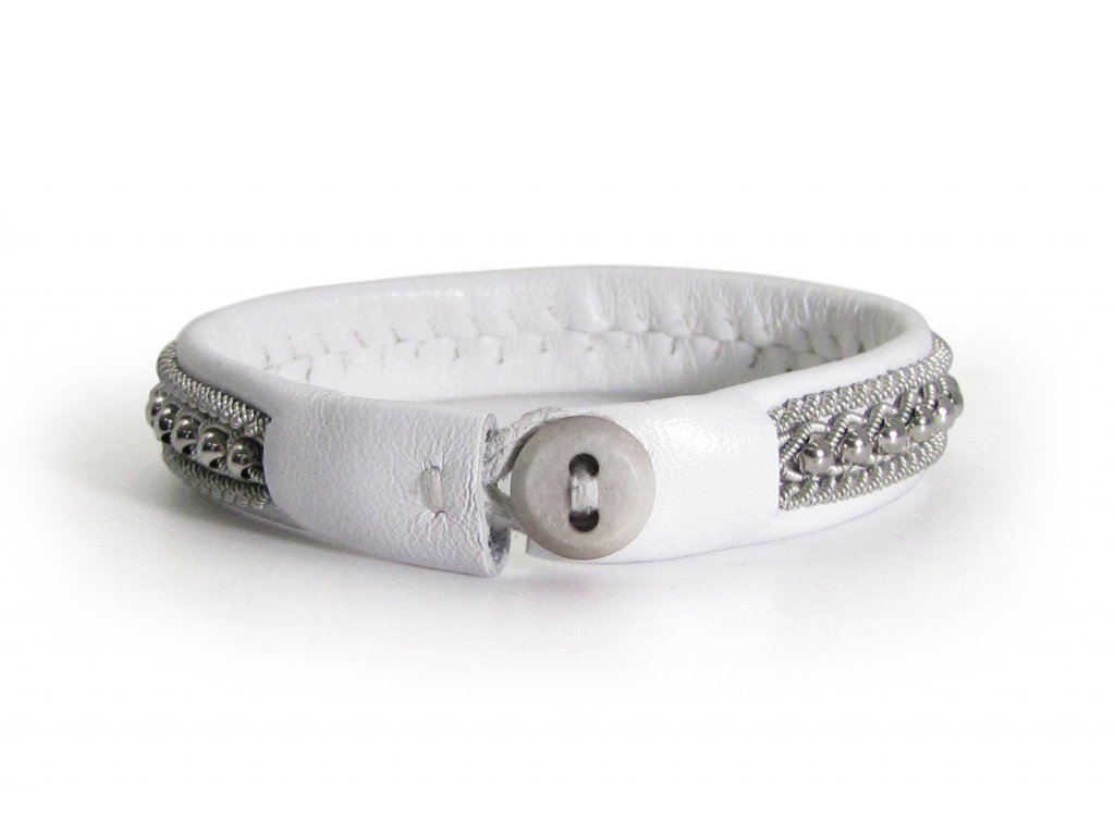 Jako výchozí materiál používáme tuzemské jehněčí nebo teletinové usně, ozdobný úplet je vytvořený z cínového drátu obsahujícího 4% stříbra. Pozlacené nebo postříbřené perly mají svůj původ ve věhlasné italské dílně, která je dodává do celého světa. Knoflík, pro změnu dovážíme z Norska, je vyřezaný z rohů laplandského soba a zapíná se do koženého nebo pruženkového ouška.