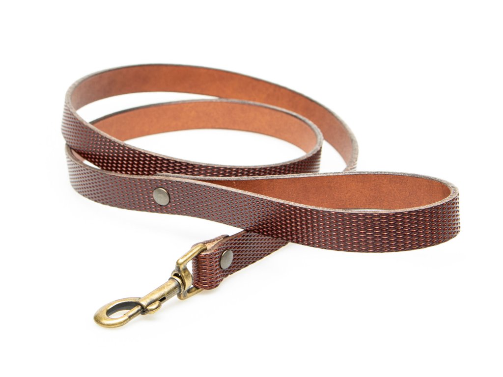 Kožené vodítko z probarvené, hovězinové usně. Karabina a nýty jsou v povrchové úpravě staromosaz. Délka karabiny je 60 mm. Tloušťka hovězinové usně je 2,5 milimetrů. Délka vodítka 120 cm, šířka 20 mm, tloušťka 2,5 mm.